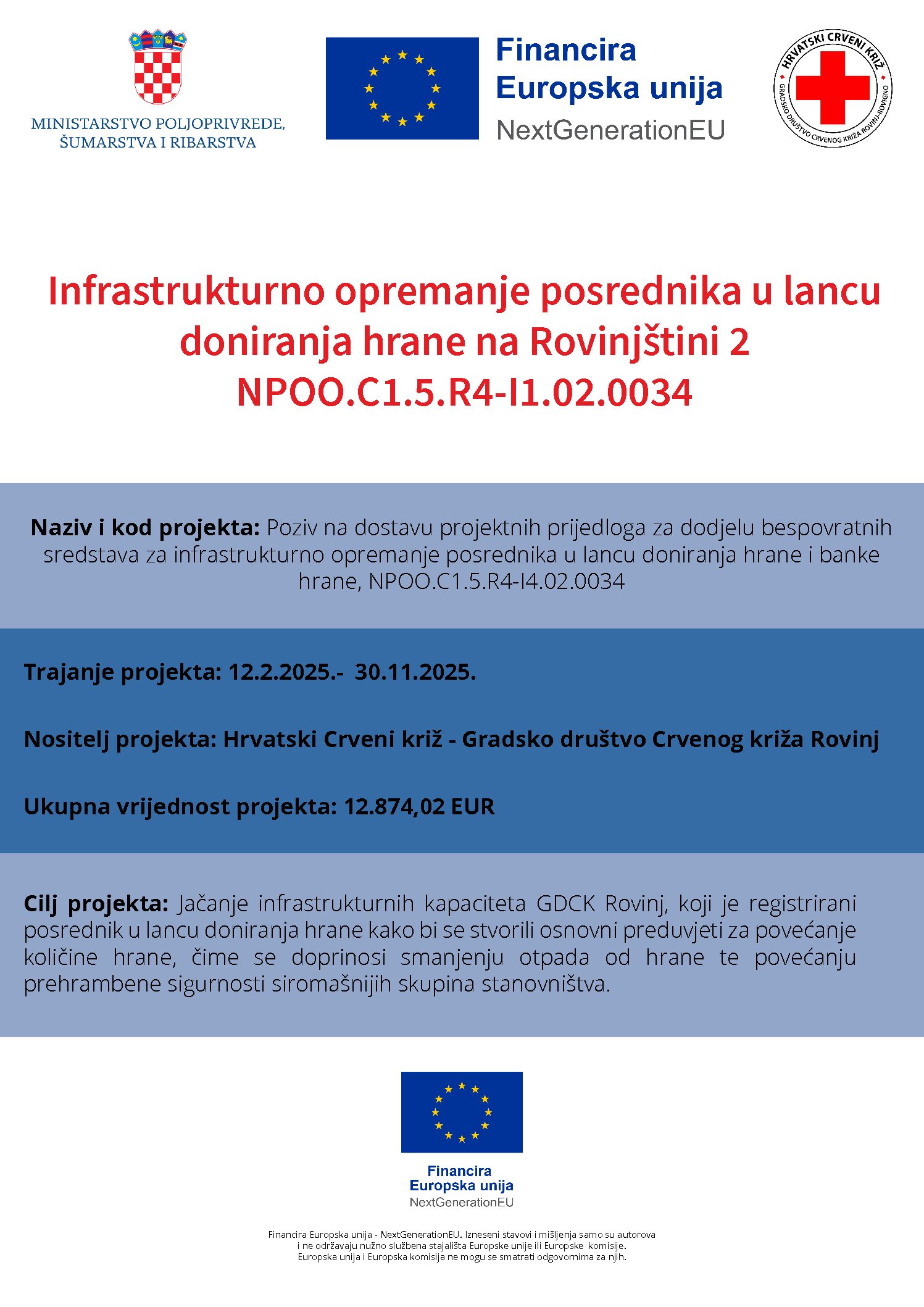 Hrvatski Crveni križ Gradsko društo Crvenog križa Rovinj u veljači je potpisao Ugovor o dodjeli bespovratnih sredstava, NPOO.C1.5.R4-I1.02.0034, s Ministarstvom poljoprivrede, šumarstva i ribarstva koje nam je odobrilo bespovratna sredstva kao posredniku u lancu donirane hrane u ukupnom iznosu od 12.847,02 eura. Putem projekta nabavljena je oprema koja će uvelike pomoći u efikasnijem radu s […]
